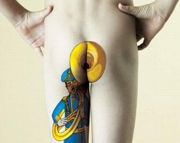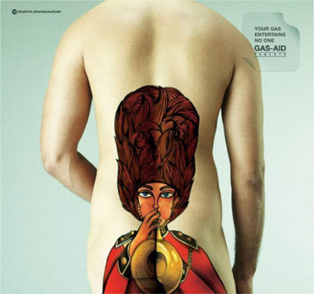 С помощью рисунков на обнаженном теле креативщики смогли непринужденно, доходчиво и с юмором рассказать о такой деликатной проблеме, как повышенное газообразование. И в частности о том, почему не стоит пукать в общественных местах. Слоган: Your gas entertains no one/Ваши газы никого не веселят.